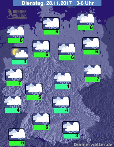 In der Nacht zum Dienstag ist der Himmel überwiegend bedeckt und es fällt verbreitet Regen, am Alpenrand auch Schneeregen oder Schnee, dazu besteht stellenweise Glättegefahr! Im Nordwesten lockert es in der zweiten Nachthälfte zeitweise auf. Die Temperatur sinkt auf 7 Grad in Leipzig und bis 3 Grad in Rosenheim. An Nord- und Ostsee weht ein teils starker bis stürmischer Wind.