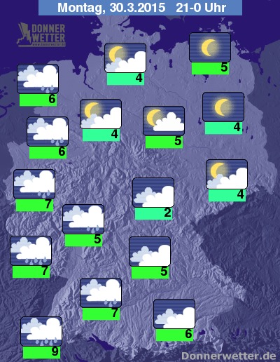 Heute Abend sind auch die Schauer in den östlicheren Landesteilen abgeklungen und der Himmel reißt häufig auf, gleichzeitig ziehen aus Westen erneut dichte Wolken auf und es fällt oft langanhaltender, ergiebiger und auch kräftiger Regen. Im Norden und Osten bleibt es bis Mitternacht noch weitgehend trocken. Die Abendtemperatur liegt bei 9 Grad in Freiburg und um 2 Grad am Elstergebirge. Es weht meist frischer bis starker und in Böen auch stürmischer Wind. An den Küsten und auf den Bergen ist es häufig stürmisch und es treten Sturmböen auf.