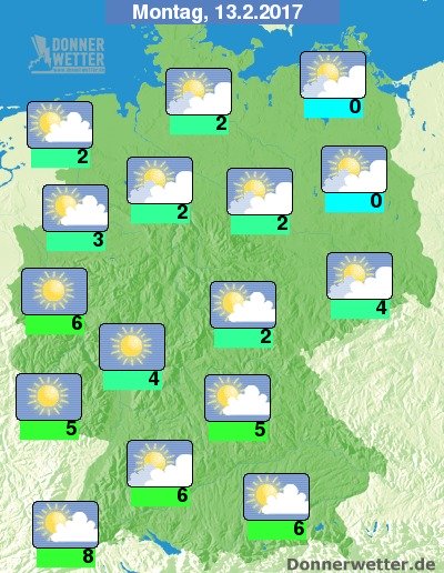 Am Montag bleibt es vor allem im Norden und Osten häufig noch längere Zeit stark bewölkt oder trüb, sonst strahlt über weiten Landesteilen jedoch die Sonne bei teils heiterem, teils sogar sonnigem Wetter, dabei bleibt es landesweit trocken. Die Temperatur steigt auf 0 Grad in Stralsund und bis 8 Grad in Konstanz.