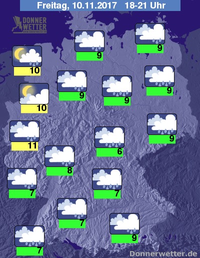 Heute Abend bleibt es fast über dem gesamten Bundesgebiet dicht bewölkt und dazu fällt auch immer wieder Regen. Am Niederrhein und an der Ems lockert es häufig auf, hier bilden sich nur noch vereinzelte Schauer. Die Temperatur liegt bei 6 bis 11 Grad. An den Küsten weht ein starker bis stürmischer Wind.