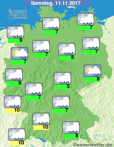 Am Samstag sind über der Nordhälfte des Landes anfangs einzelne Auflockerungen möglich, sonst ziehen jedoch größtenteils dichte Wolken durch und es fällt verbreitet Regen. Die Temperatur erreicht herbstliche 5 bis 10 Grad. An der Ostsee weht noch ein oft starker Wind.