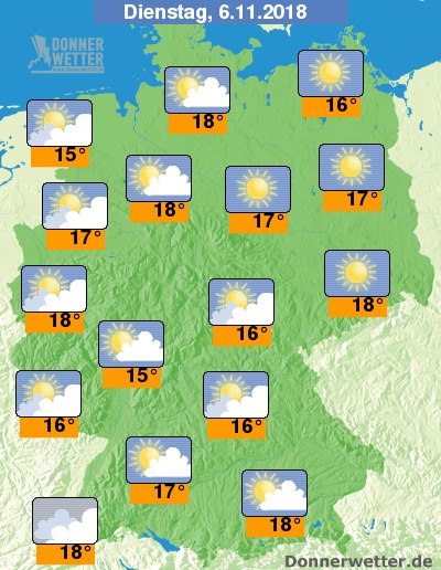 Nach unterschiedlicher Auflösung regionaler Nebelgebiete oder hochnebelartiger Wolken, strahlt vor allem über der Nordosthälfte längere Zeit die Sonne. Über den Südwesten und Westen ziehen Wolkenschleier vorüber, welche die Intensität der Sonne mindern können. Dennoch wird es nahezu im gesamten Land für Anfang November ungewöhnlich mild.