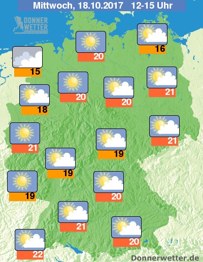 Heute Abend bleibt es von der breiten Landesmitte bis nach Süddeutschland meist sonnig und nur hier und da auch locker bewölkt, im Norden ist es meist leicht bis wechselnd bewölkt, jedoch ebenfalls trocken. Die Temperatur liegt bei 16 Grad in Emden und bis 23 Grad in Freiburg.