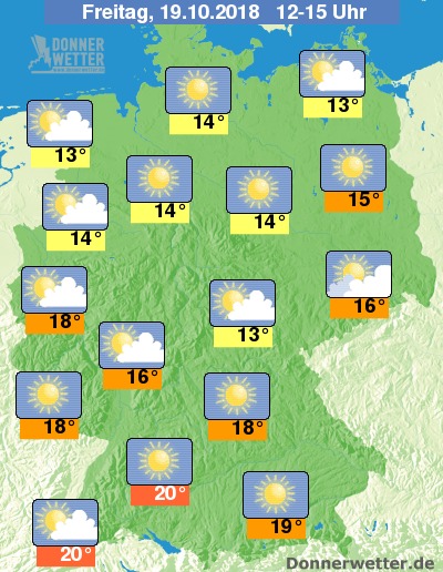 Am frühen Nachmittag sollten sich Nebelgebiete oder hochnebelartige Bewölkung weitestgehendst aufgelöst haben, so dass verbreitet die Oktobersonne strahlen kann. Dabei bleibt es niederschlagsfrei.