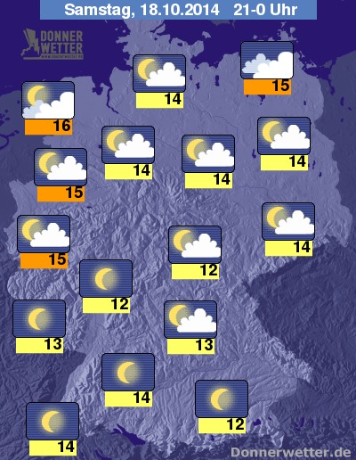 In der Nacht zum Sonntag zieht im Norden und Osten weitgehend lockere bis aufgelockerte Bewölkung durch, weiter südwestlich wird es dagegen verbreitet sternenklar, nur selten bildet sich Nebel oder Dunst. Die Temperatur sinkt bis zum Morgen auf 15 Grad auf den Nordseeinseln und bis etwa 9 Grad im Grabfeld.