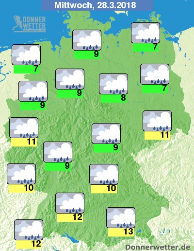 Abgesehen von kleineren Auflockerungen dominieren im gesamten Land die Wolken. Zunächst regnet es nur gebietsweise etwas, oder es treten leichte Schauer auf. Am Nachmittag setzt von Westen her flächendeckender Landregen ein. An der Grenze zu Dänemark fallen wahrscheinlich auch einige nasse Schneeflocken. Die Höchsttemperaturen liegen im Norden meist zwischen 3 und 10 Grad, in der Mitte und im Süden können vorübergehend 10 bis 14 Grad erreicht werden. Der Wind kann zeit- und gebietsweise kräftiger auffrischen.