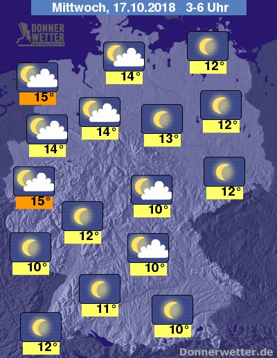 Auch während der zweiten Nachthälfte bleibt es vielfach sternenklar oder nur leicht bewölkt. Stellenweise können sich allerdings Dunst- oder Nebelfelder bilden. Bis zu den Frühstunden kühlt die Luft auf 10 bis 15 Grad ab. Außerhalb von Ortschaften, sowie in geschützten Tälern und Mulden kann es aber um einiges kälter werden.