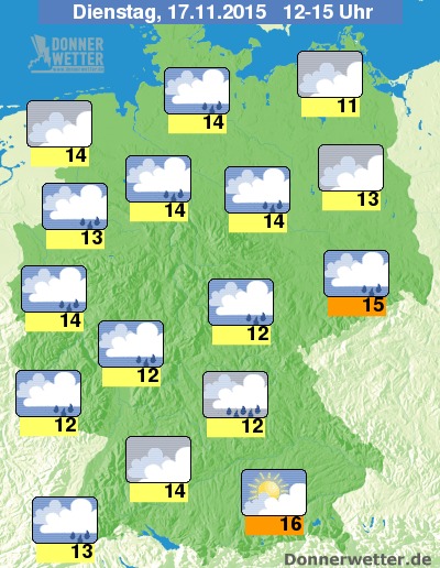 Eine meist geschlossene Wolkendecke sorgt in den Nachmittags- und Abendstunden in weiten Teilen des Landes für Schauer. Einzelne Auflockerungen sind im vor allem entlang der Alpen sowie vereinzelt in der Osthälfte zu erwarten.