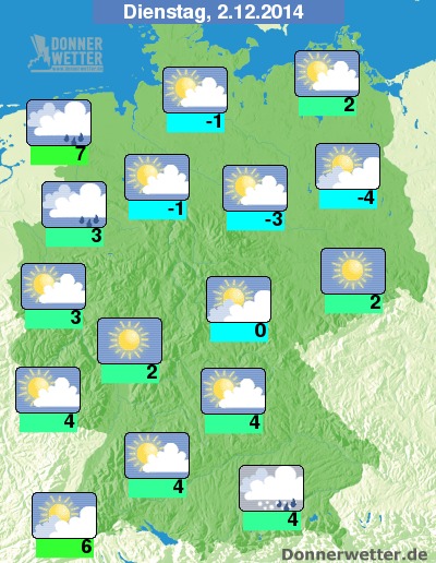Am Dienstag bringt ein Tiefausläufer im Nordwesten dichte Wolken und einsetzenden Regen, dazu besteht akute Glättegefahr durch möglichen überfrierenden Regen, auch am Alpenrand kann es bei dichten Wolken und gelegentlichen Schneefällen teils glatt werden. Sonst ist es meist aufgelockert bewölkt, zum Teil auch noch heiter und es bleibt trocken. Die Temperatur steigt auf -4 Grad in Potsdam und etwa 7 Grad im Emsland.