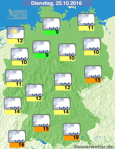 Am Dienstag zeigt sich der Himmel verbreitet dicht bewölkt und es fällt zudem auch immer wieder Regen. Meist trocken uns teils nur locker bewölkt ist es rund um die Nordsee. Die Temperatur steigt auf 9 bis 19 Grad.