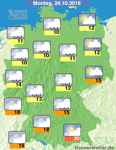 Zum Start in die neue Woche geht es verbreitet mit starker Bewölkung weiter, dabei zieht im Tagesverlauf von Westen her Regen auf, der sich bis zum Abend auch bis in den Osten des Landes ausbreitet. Freundlicher und meist trocken ist es im Nordosten und über dem äußeren Süden Deutschlands. Es werden 10 bis 15, im Süden bis 20 Grad erreicht.