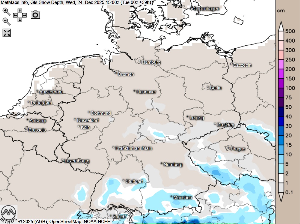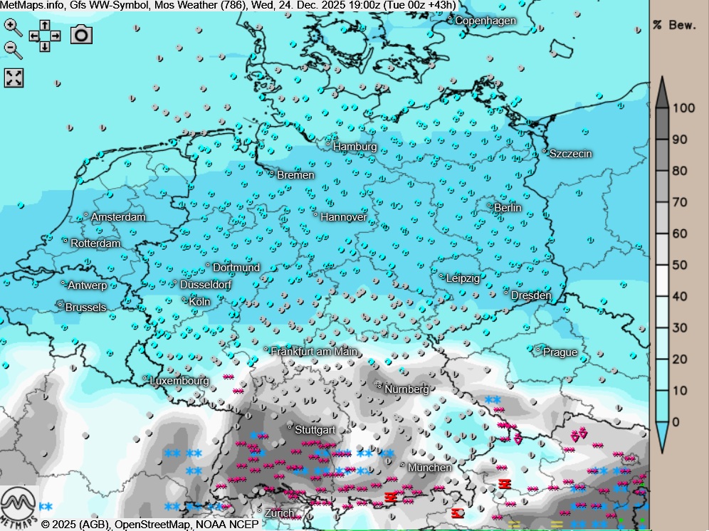 An Heiligabend zeigt sich der Himmel über der Südhälfte Deutschlands sowie über dem Südosten überwiegend bedeckt. Dabei gibt es stellenweise etwas Schneegriesel oder leichten Schneefall, in tieferen Lagen lokal auch zunächst mit Regen vermischt. Im Tagesverlauf klingen die Niederschläge allmählich ab.