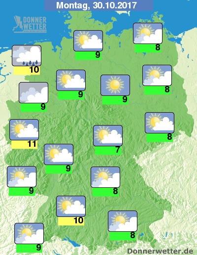 Die hinter dem nach Russland abziehenden Sturmtief einfließende Polarluft kommt unter dem Einfluss eines Hochs bei den Britischen-Inseln zur Ruhe. Dieses Hochdruckgebiet legt sich in den nächsten beiden Tagen quer über Mitteleuropa und sorgt in weiten Teilen Deutschlands für recht freundliches Herbstwetter. Nur der Norden wird von Störungsausläufern Nordatlantischer Tiefdruckgebiete erfasst.