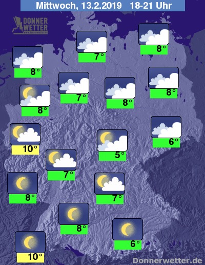 Während der zweiten Nachthälfte lichtet sich die Bewölkung auch stellenweise im Norden. Sonst leuchten bei meist nur lockerer Bewölkung verbreitet Mond und Sterne.