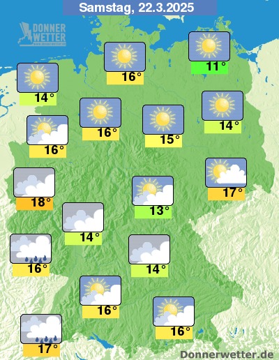 Am Samstag ist es von der Nordseeküste bis nach Ostsachsen sonnig. In den übrigen Landesteilen verläuft der Tag überwiegend heiter bis wolkig, in der West- und Südwesthälfte ist es auch stark bewölkt. Hier muss im Tagesverlauf auch mit einzelnen Schauern oder leichtem Regen gerechnet werden, im Südwesten sind zudem lokale Gewitter möglich.