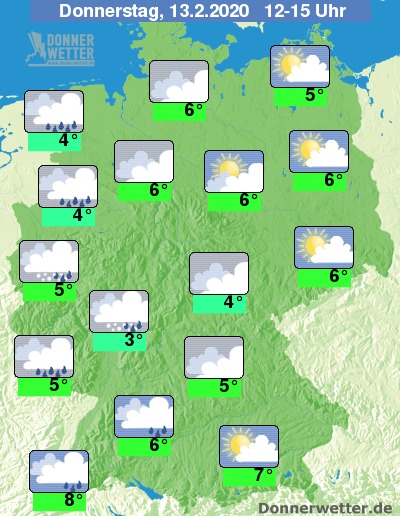In den Mittagsstunden zeigt sich der Himmel in der Osthälfte und am Alpenrand zunächst noch heiter bis wolkig oder aufgelockert bewölkt und es bleibt trocken. Im Westen ist es überwiegend stark bewölkt oder bedeckt und immer wieder muss mit Schauern gerechnet werden, die meist als Regen, Schneeregen oder Graupel, oberhalb von 400 Metern auch als Schnee fallen können. Vorsicht, regionale Straßenglätte!