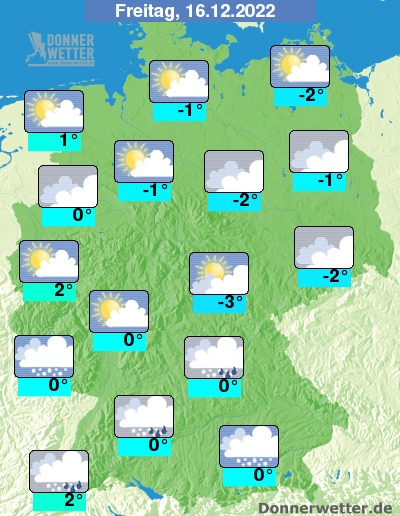 Am Freitag ist es im Süden bedeckt und es fällt zeitweise Schnee, zum Teil auch Schneeregen, dabei ist erhebliche Glätte möglich! Im Osten ist es stark bewölkt, jedoch meist trocken. Im übrigen Land ist es zum Teil heiter, teils einige Wolken durchziehen, dabei bleibt es weitgehend trocken. Die Temperatur steigt auf -3 Grad im Vogtland und bis 2 Grad im Rheinland.