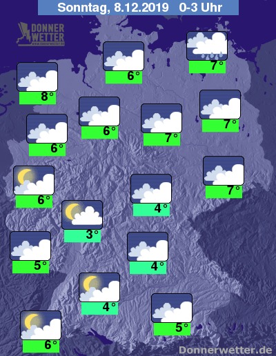 In der Nacht ist der Himmel über dem Norden und Osten des Landes überwiegend bedeckt, im Süden lockern die Wolken im Nachtverlauf zunehmend auf, so dass der Himmel meist locker oder aufgelockert bewölkt ist. Einzelne Schauer sind in der Nacht nur zeitweise an der Ostseeküste zu erwarten. Der Wind frischt in der Nacht und weht im Westen und Nordwesten teils stürmisch aus Südwest. An den Küsten sind auch Sturmböen möglich.