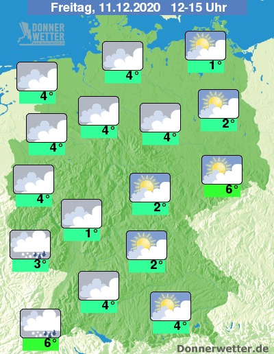 Bis zum frühen Abend breitet sich der Niederschlag bis ins Rhein-Main-Gebiet und nach Schwaben aus und fällt zunächst zum Teil als Schneeregen, in höheren Lagen auch als Schnee mit Glättegefahr. Auch an Niederrhein und Ems kann es nass werden, hier jedoch meist ausschließlich in Form von Tropfen. Sonst bleibt es bei dem ruhigen, trockenen, aber meist trüben Frühwinterwetter.