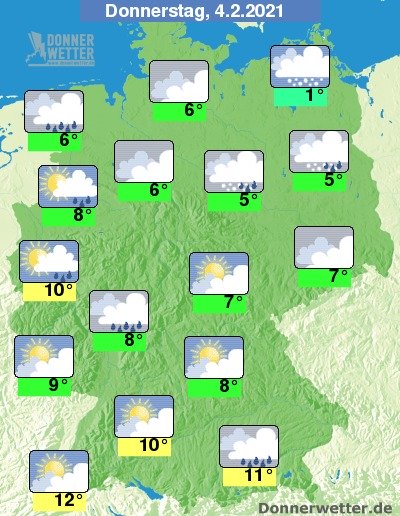 Am Donnerstag fällt über dem Norden und Osten unter dichten Wolken anfangs noch gebietsweise Schnee, zum Teil auch Schneeregen oder Regen. Im übrigen Bundesgebiet ist es oft stark, teils auch aufgelockert bewölkt, dabei fällt nur vereinzelt etwas Regen. Die Temperatur steigt auf 1 Grad an der Müritz und bis zu 12 Grad im Breisgau.