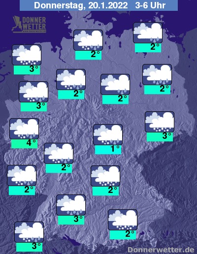 Am Donnerstag sind hier und sonnige Abschnitte möglich, es ziehen jedoch oft auch dichte Wolken durch, dabei bilden sich teils kräftige Schnee-, Schneeregen- oder Graupelschauer. Die Temperatur steigt auf 1 Grad im Grabfeld und bis 5 Grad an der Nordsee. Es weht zudem ein oft starker und teils stürmischer Wind, an der See ist es verbreitet stürmisch.