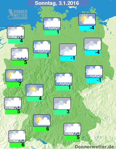 Heute zeigt sich der Norden und Osten verbreitet stark bewölkt, dabei ist hier und da auch etwas Schneefall möglich, zumeist bleibt es aber trocken. Über der Südwesthälfte der Republik ist es häufig stark, zeitweise aber auch aufgelockert bewölkt, nur gebiestweise fällt etwas Regen, zum Teil auch Schneeregen. Im Südwesten ist es auch vielerorts heiter. Die Temperatur steigt auf -4 Grad in Vorpommern und bis 7 Grad in Düsseldorf. Im Norden weht teils starker, an den Küsten ein teils stürmischer Wind.