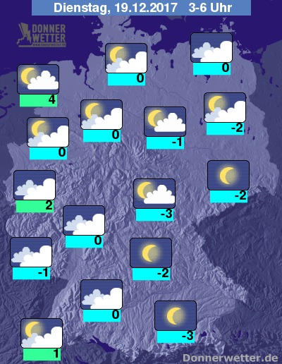 In der folgenden Nacht zeigt sich von Bayern, über Thüringen, Sachsen bis Berlin-Brandenburg ein meist sternenklarer Nachthimmel. Oft stark bewölkt oder trüb ist es vom Südwesten bis in den Westen Deutschlands, dazu bleibt es trocken. In den übrigen Landesteilen ist es teils aufgelockert, gebietsweise aber auch stark bewölkt, jedoch überall trocken. Die Temperatur sinkt auf 4 Grad an der Nordsee und bis -3 Grad im Umland von München.