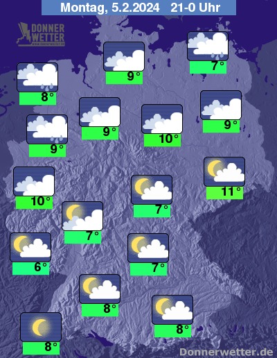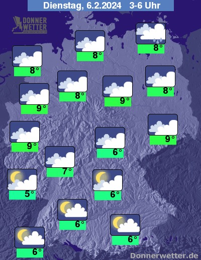 In der Nacht auf Dienstag zeigt sich der Himmel über der Nord- und Nordosthälfte bedeckt und zeitweise fällt etwas Regen. In der Landesmitte überwiegt in der Nacht wechselnde oder starke Bewölkung, es bleibt aber meist trocken; im Süden zeigen sich die Nachtstunden nur gering bewölkt oder es ist sternenklar.
