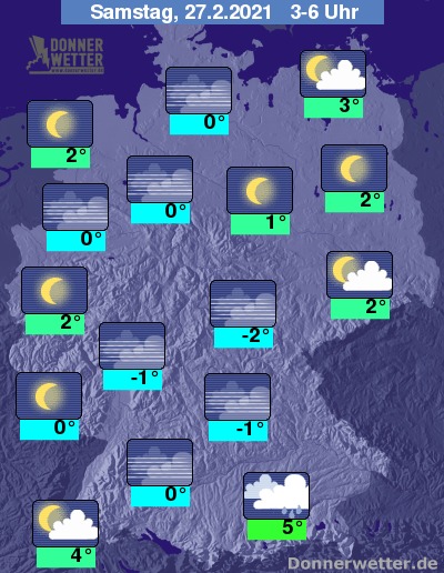 In der Nacht zum Samstag fällt zunächst im Süden und gegen Morgen dann nur noch im Alpenvorland weiterer Regen, zum Morgen hin teils auch Schneeregen oder Schnee. Im übrigen Bundesgebiet zeigt sich der Himmel überwiegend locker bewölkt und oft sternenklar, dazu bleibt es trocken. Stellenweise bildet sich Nebel. Die Temperatur sinkt auf 5 Grad in München und bis -2 Grad in Jena.