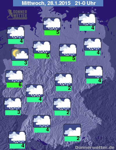 In der Nacht zum Donnerstag fällt vor allem Im Stau der Nordalpen, aber auch im übrigen Süddeutschland sowie in Sachsen und an der Ostsee teils kräftiger Schnee. An der Nordsee sind bei meist dichten Wolken teils kräftige Graupel- und Schneegewitter möglich. Sonst klart der Himmel besonders im Norden Deutschlands verbreitet auf und es bleibt trocken. In der Mitte des Landes ist es teils stark, teils aufgelockert bewölkt, aber ebenso trocken. Die Tiefstwerte liegen bei 3 Grad am Jadebusen und -2 Grad im Coburger Land. Vor allem in der Nordhälfte weht noch ein oft frischer und teils starker, in Böen stürmischer Wind, an der See und auf den Bergen sind noch Sturmböen möglich.