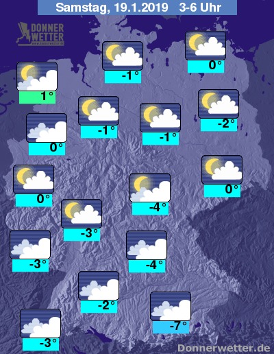 Der Samstag startet verbreitet bedeckt oder aufgelockert bewölkt, entlang der Oder sowie in der Westhälfte sind auch längere heitere Phasen zu erwarten. Schauer bleiben meist aus, die Temperaturen liegen mit Werten um -7 bis 1 Grad C nahezu bundesweit im Frostbereich.