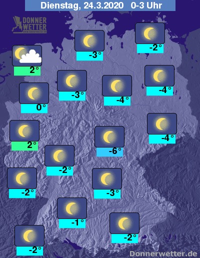 Die Temperaturen sinken, ausgenommen die Nordseeküste, meist überall in den Frostbereich; die Tiefstwerte liegen dann bei 0 Grad in der Kölner Bucht und um -7 Grad in Franken. Auf den Gipfeln der Mittelgebirge sowie in den Alpen fällt das Thermometer auch auf Werte um -10 Grad.