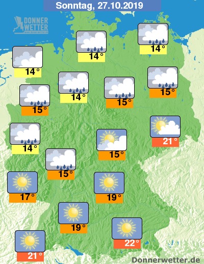 Am Sonntag ist es im Süden, anfangs auch über Sachsen noch heiter bis sonnig und dabei trocken. Im übrigen Bundesgebiet ziehen von Nordwesten her meist dichte Wolken durch, dabei fällt auch zeitweise Regen. Die Temperatur erreicht 14 Grad im Norddeutschen Tiefland und bis zu 22 Grad in München.