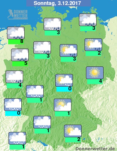 Am Sonntag ist es von Bayern bis nach Sachsen meist heiter bis sonnig und bis zum Abend auch trocken. Im großen Rest der Republik ziehen verbreitet dichte Wolken durch, die zeitweise Regen, Schneeregen oder Schnee bringen, dazu besteht Glättegefahr! Die Temperatur erreicht 0 Grad im Grabfeld und bis 8 Grad an der Nordseeküste.