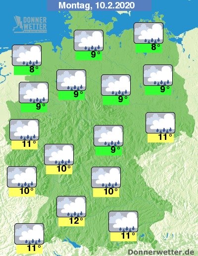 Am Montag überwiegend stark, nur selten auch aufgelockert bewölkt, wiederholt, teils kräftige Schauer. Es weht ein verbreitet starker bis stürmischer Wind, teils herrscht auch im Flachland Sturm. Auf den Bergen und an der See herrscht teils schwerer Sturm oder orkanartigen Böen. Die Temperatur steigt auf 8 Grad an der Müritz und bis 12 Grad in Schwaben.