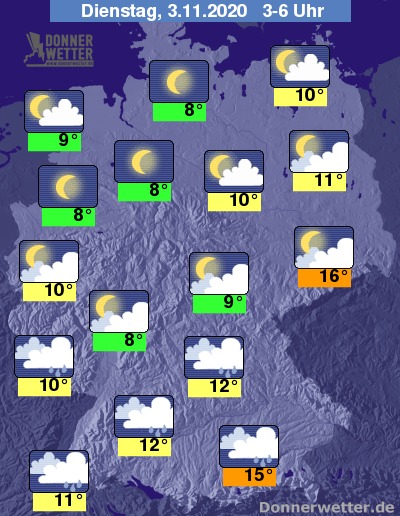 Die Temperaturen gehen in der Nacht auf Werte meist um 12 bis 9 Grad zurück. Am mildesten bleibt es zunächst noch an den Alpen sowie im äußersten Südosten mit Werten teils um 16 Grad.