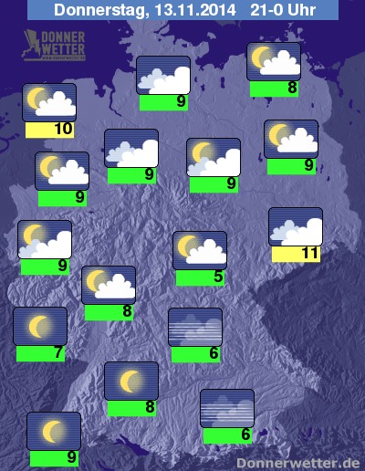 Am Abend bleibt es in der Osthälfte bei meist starker, gebietsweise aber auch bei aufgelockerter Bewölkung, dagegen reißt der Himmel nach Südwesten hin verbreitet auf und die Sterne kommen zum Vorschein. Auch im Westen und Nordwesten ziehen meist nur lockere Wolkenfelder durch. Es bleibt praktisch überall trocken. Im Süden bildet sich örtlich Nebel oder Hochnebel. Die Abendtemperatur liegt bei 11 Grad in der Lausitz und etwa 5 Grad im Vogtland.