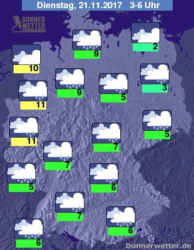 In der Nacht zum Dienstag ist es bedeckt und es fällt immer wieder Regen. Die Temperatur sinkt auf 11 Grad in Köln und bis 2 Grad in Vorpommern.