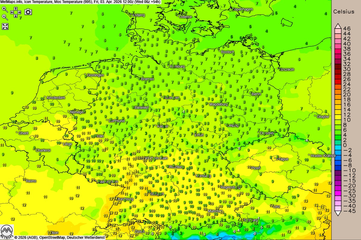 Die Wetter- und Temperaturkarte (06:00 Uhr / 15:00 Uhr) sowie die 24-Stunden-Regenmengen für Freitag nach ICON: