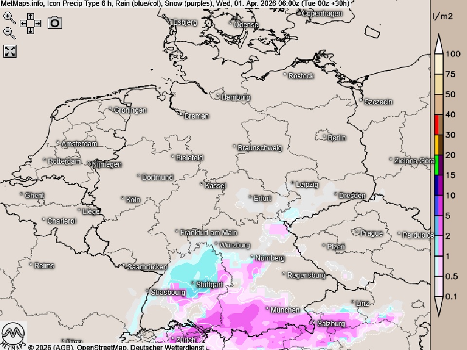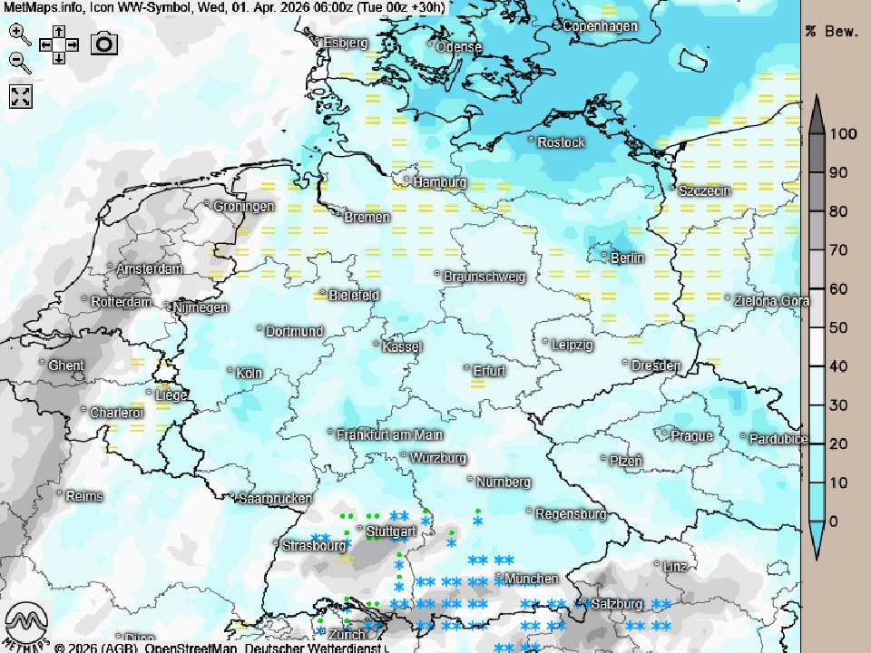 Am Mittwoch fällt an den Alpen anfangs noch Schnee, im Tagesverlauf lässt dieser dann zögerlich nach. Auch im Süden und Südosten sind am Mittwoch bei stärkerer Bewölkung einzelne Schauer möglich. In den übrigen Landesteilen wechseln sich am Mittwoch Sonne und Wolken ab und es bleibt meist trocken.