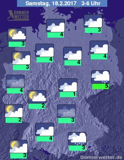 Am Samstag ist es im Südwesten und Nordwesten des Landes oft heiter oder aufgelockert bewölkt, auch im Westen lässt sich zwischen den Wolken hier und da die Sonne blicken. Im übrigen Bundesgebiet ist es hingegen häufig stark und zur zum Teil auch aufgelockert bewölkt, jedoch weitgehend trocken. Die Temperatur steigt auf 5 Grad im Thüringer Becken und bis 9 Grad am Oberrhein.