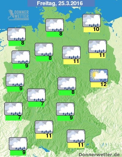 Am Freitag bleibt es über der Bundesrepublik verbreitet bedeckt und es fällt auch immer wieder Regen, erst zum späten Nachmittag und gegen Abend klingt der Regen von Nordwesten her ab und nachfolgend lockert die Bewölkung hier auch auf. Die Temperatur steigt auf 7 Grad im Saargau und bis 12 Grad in Leipzig.