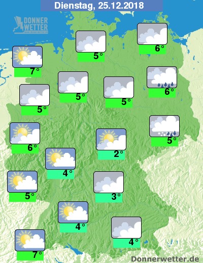 Am 1. Weihnachtsfeiertag bleibt es über der Osthälfte und im Norden meist bedeckt, es fällt jedoch nur von Sachsen bis nach Berlin-Brandenburg noch gelegentlich etwas Regen oder Schneeregen. Im übrigen Bundesgebiet ist es teils wechselnd, teils stark bewölkt und es bleibt trocken. Die Temperatur erreicht nur noch 2 bis 7 Grad.