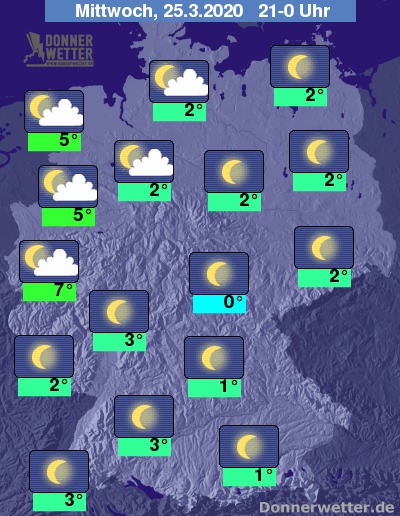 Bis zu den Frühstunden wird es wieder sehr kalt. Die Luft kühlt verbreitet in den leichten Frostbereich ab. In geschützten Tälern droht sogar wieder mäßiger Frost mit Werten von unter -5 Grad. Frostfrei bleibt es nur direkt auf der Nordsee, sowie auf den Inseln.