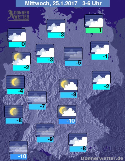 Heute Abend ist der Himmel meist wolkenverhangen, gebietsweise hält sich Nebel oder Hochnebel. Hier und da lockert die Bewölkung etwas auf. Es bleibt bundesweit trocken bei Werten zwischen -4 Grad in München und um 3 Grad in Emden.