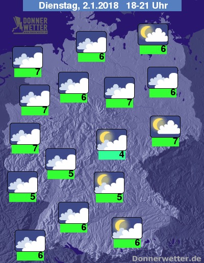Heute Abend sind auch die letzten Niederschläge im Südosten abgeklungen und im Süden und Osten lockert der Himmel auch häufig auf. Im übrigen Land zieht es sich dagegen meist zu, dabei bleibt es aber vorerst trocken. Im Grenzgebiet zu Benelux und Frankreich zieht jedoch im weiteren Verlauf Regen auf. Die Temperatur liegt bei 4 bis 7 Grad.