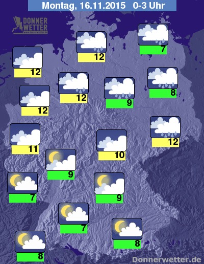 In die neue Woche geht es vor allem im Nordosten des Landes regnerisch, in der Nordhälfte klingen die Schauer häufig ab. Trockenes Wetter ist in weiten Teilen der Südhälfte zu erwarten, hier zeigt sich der Himmel in den frühen Morgenstunden sogar häufig sternenklar. Die Temperaturen sinken in der Nacht auf Tiefstwerte um 12 Grad C an der bewölkten Nordseeküste und 7 Grad C im Pfälzer Wald.