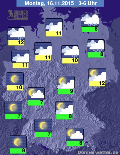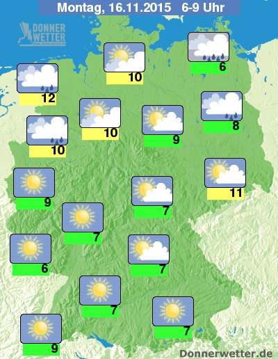 Über freundliches Wetter auf dem Weg zur Arbeit dürfen sich am Montagmorgen vor allem die süd- und westdeutschen Bundesländer freuen. Im Nordwesten und -osten startet der Montag dagegen häufig grau und nass. Die Temperaturen erreichen Werte um 7 Grad C im Alpenvorland und 12 Grad C im Emsland.