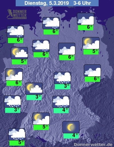 In der Nacht kann es in den Höhenlagen zu Schneeregen kommen. Um Oberbayerm klart der Himmel weitestgehend auf, wobei der Rest des Landes meist einen stark bewölkten Himmel in der Nacht hat. Die Temperaturen fallen auf 6 Grad C an der Ostseeküste und 3 Grad C um Thüringen.