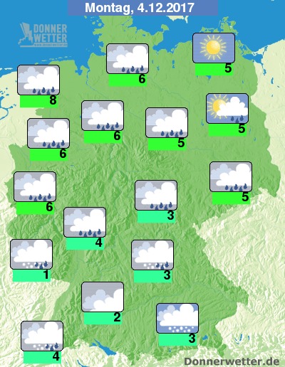 Die neue Woche startet für mit Abstand meisten von uns grau in grau und dazu zeitweise auch regnerisch, nach Süden hin fällt vor allem zu Beginn häufig Schnee oder Schneeregen. Nur im Nordosten scheint die Sonne von einem oft wolkenlosen Himmel, dazu bleibt es hier trocken. Die Temperatur erreicht 1 bis 8 Grad.